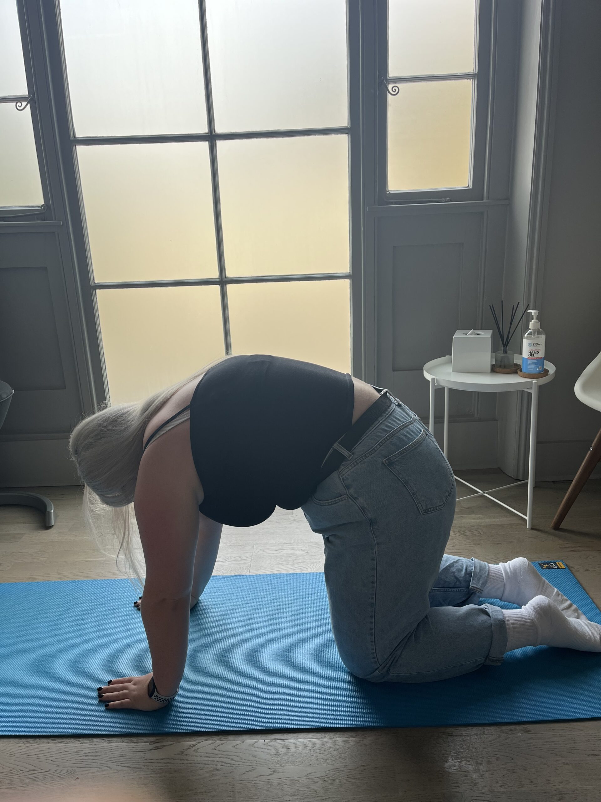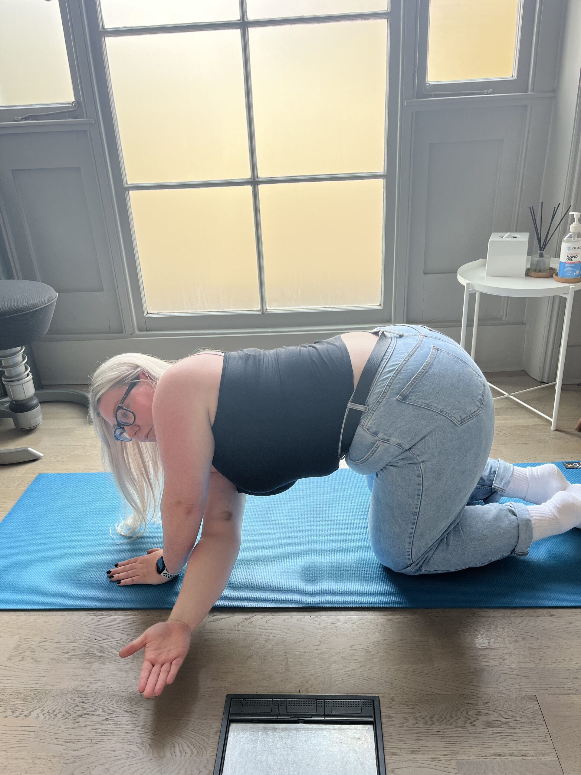 Starting position: Hands and knees, elbows a little bent, fingers spread out evenly on the floor.