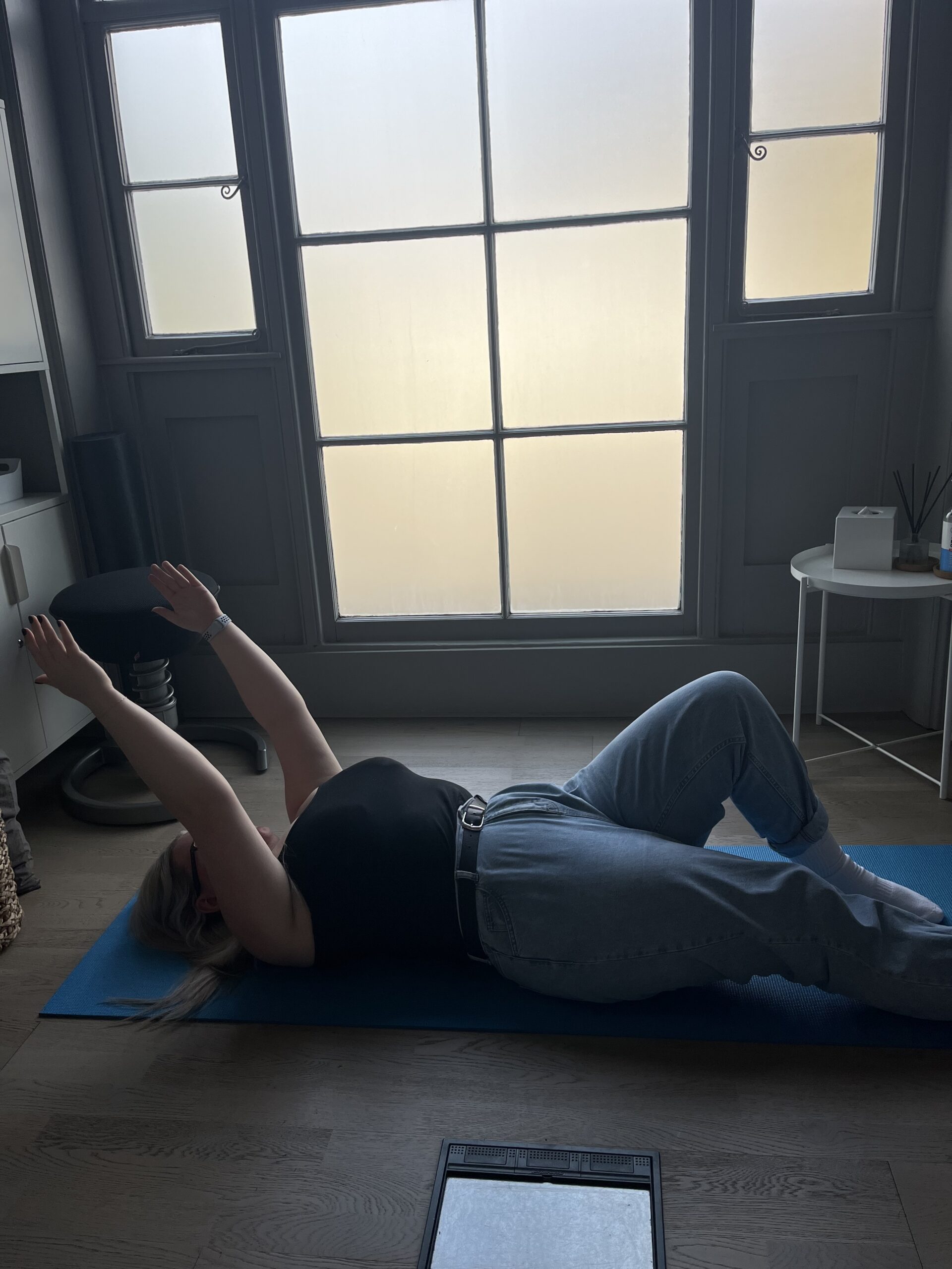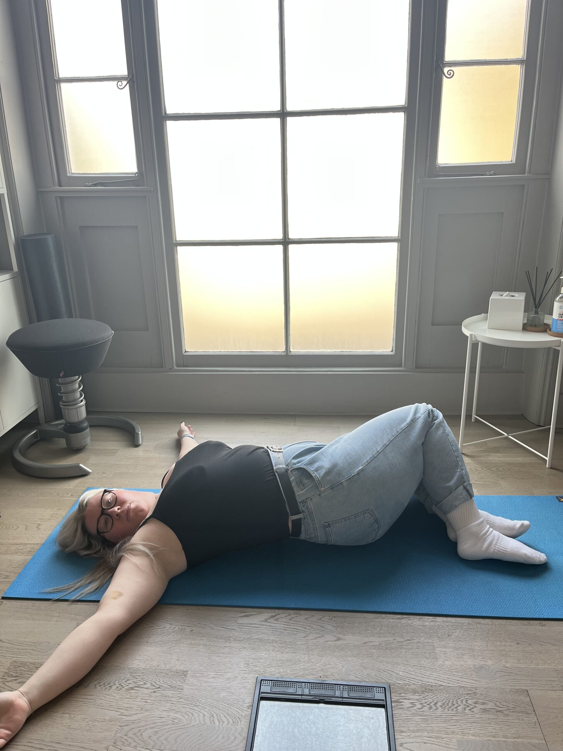 Neutral starting position: Lie on your back with knees bent and feet flat on floor. Do a slow exhale to feel your lower rib cage drop down towards the floor so that your back is relaxed and resting on the floor. Pelvis centred so that you only have a small space (for example to fit an imaginary grape) under the very lower part of your back.