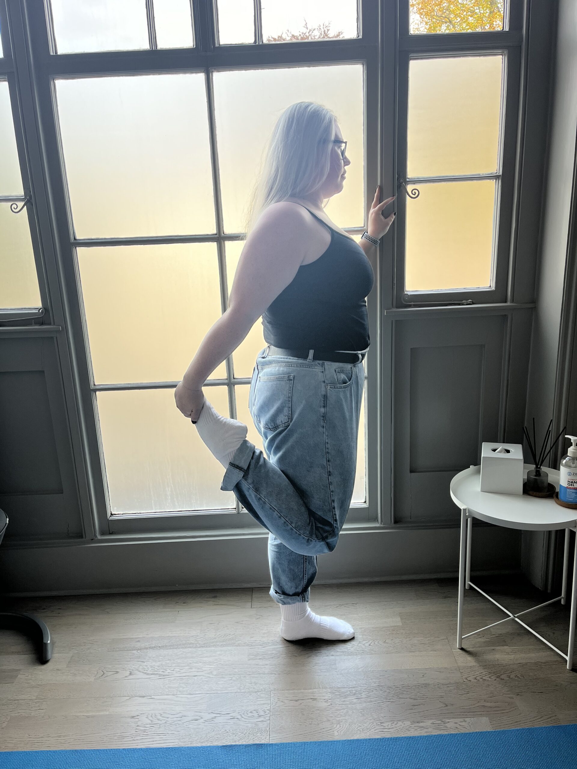 Action: Use your hands to pull your heel up towards your bottom to feel a gentle stretch on the front of your thigh.