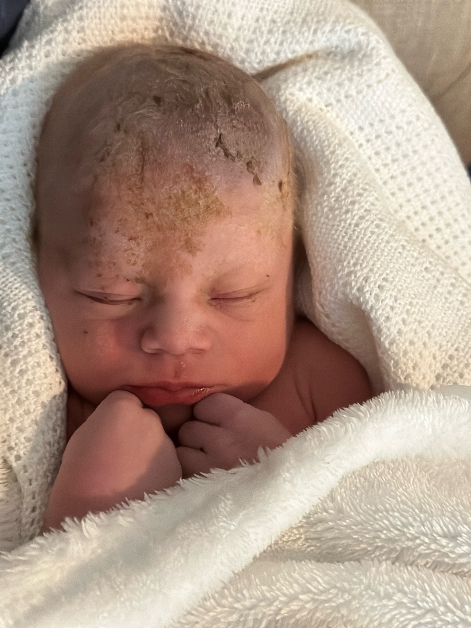 He wasn’t quite making the right noises initially, so there was a lot of back/body rubbing occurring whilst he was on me. Oli was just conscious of the meconium, aware that he might have inhaled some and wanted him to be crying or making some strong sounds to ensure it was clear from his lungs. It also become blatantly obvious what the problem had been, due to the shape of his head. He had the same suction mark and swelling as if he had been pulled out by ventouse. Oli explained that his neck would have been deflexed, so instead of entering through the crown of his head, the smallest part, he was coming through the very top, the widest.