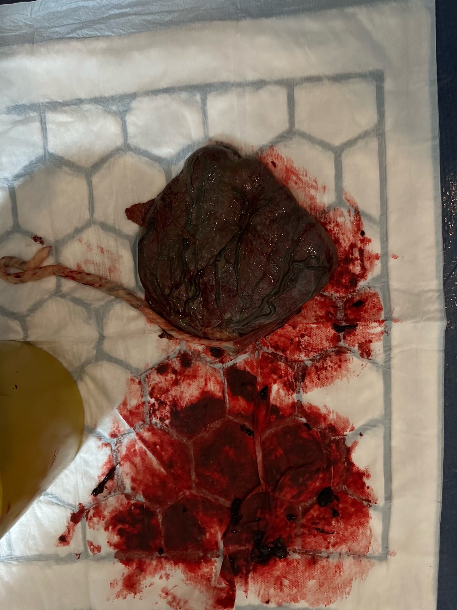 Two hours went by and I was feeling tethered and immobilised from being attached to the baby lying on shower curtains. Not to mention sore downstairs and globally uncomfortable with the most severe DOMs I’ve ever known. At this stage we decided to cut the cord, which JJ had the privilege of doing. It had definitely stopped pulsing and the cord was white, so I was satisfied the baby had received all the goodness from it. I could really sense the midwife, a new one after Oli had left, was starting to become irritated as I wouldn’t accept the injection as the placenta hadn’t come out yet. A midwife must stay with you for two hours after the placenta is out to make sure you don’t haemorrhage, which there was still apprehension of due to the blood in the waters during labour. To mitigate against this, I decided to dab some of the blood from the placenta into the side of my mouth. Now I know this is gross, but having read this can help prevent haemorrhaging I was prepared to do anything to stop this happening.