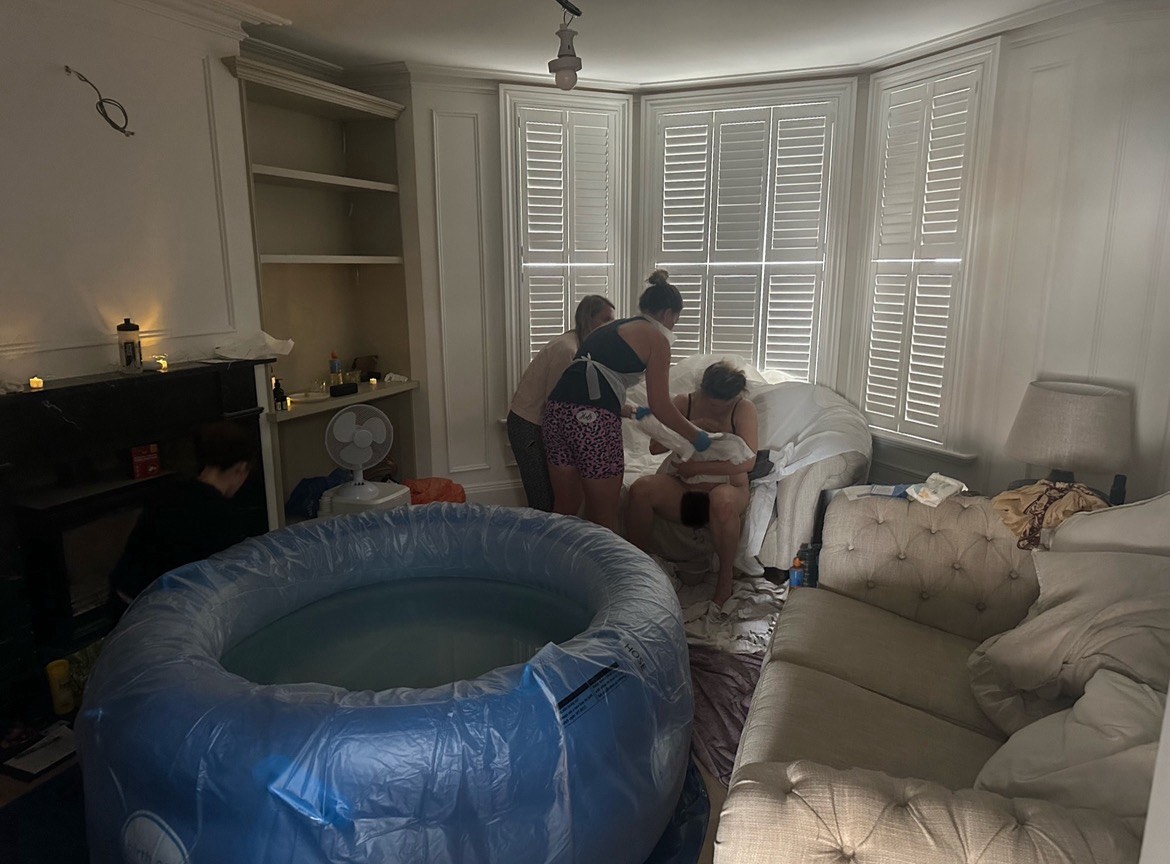 After my waters broke, the contractions intensified pretty quickly. I was left on the bedroom floor in an adapted child’s pose breathing through the contractions, whilst frantically cancelling appointments by text and letting Gabby, our Clinic Manager, know that I was signing off and she needed to take the full reigns. JJ was down in the basement trying to fix the boiler, whilst the midwife and Doula were on their way. I remember labouring in my bedroom for quite a few hours. I spent most of the time lying down on my side with my Doula, Sinead, helping me with leg lift rotations during contractions to help open my pelvis or applying pressure on my back. All my contractions were in my back and felt like very intense period pain. I wouldn’t have been able to cope with them without hands baring down for each contraction. I did try a few other positions whilst in the bedroom, from bouncing on my birth ball to kneeling, but was most comfortable on the bed.