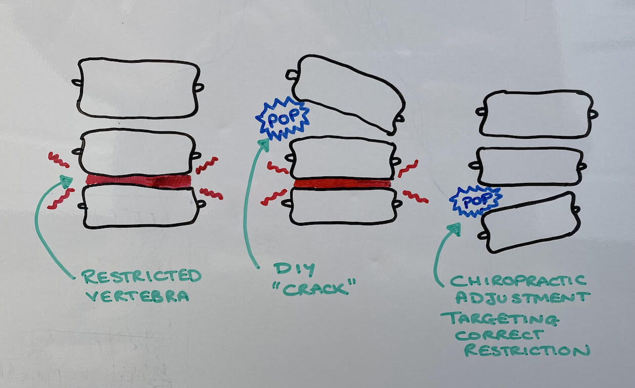 The reason why it isn’t helpful is because by self-cracking you are usually getting the exact same joint every time. This leads to that joint becoming hyper-mobile, meaning it moves too much. (Check out my previous blog for more info on Hypermobility.) You may find it even starts cracking on its own by simply turning your neck or rolling out of bed. By encouraging or producing a hyper-mobile joint, you create the joint directly above and/or below to tighten up and become restricted. THIS joint is the one that needs cracking, or adjusting, as we call it in the Chiropractic world.