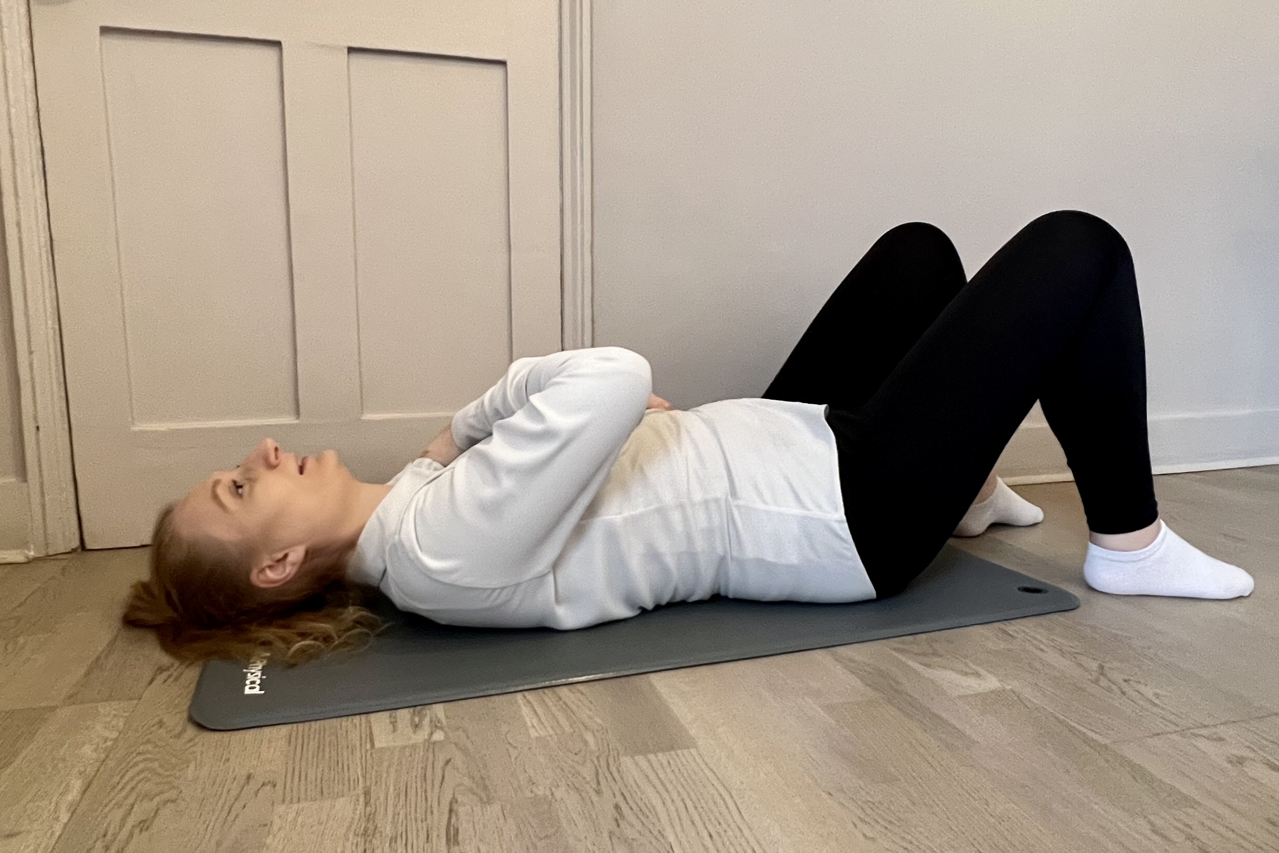 Lie flat on your back, and engage your deep core muscles by drawing your belly button inwards (towards your spine slightly), while flattening your spine against the floor, then relax. Hold for a breath in and out, Repeat 8 times