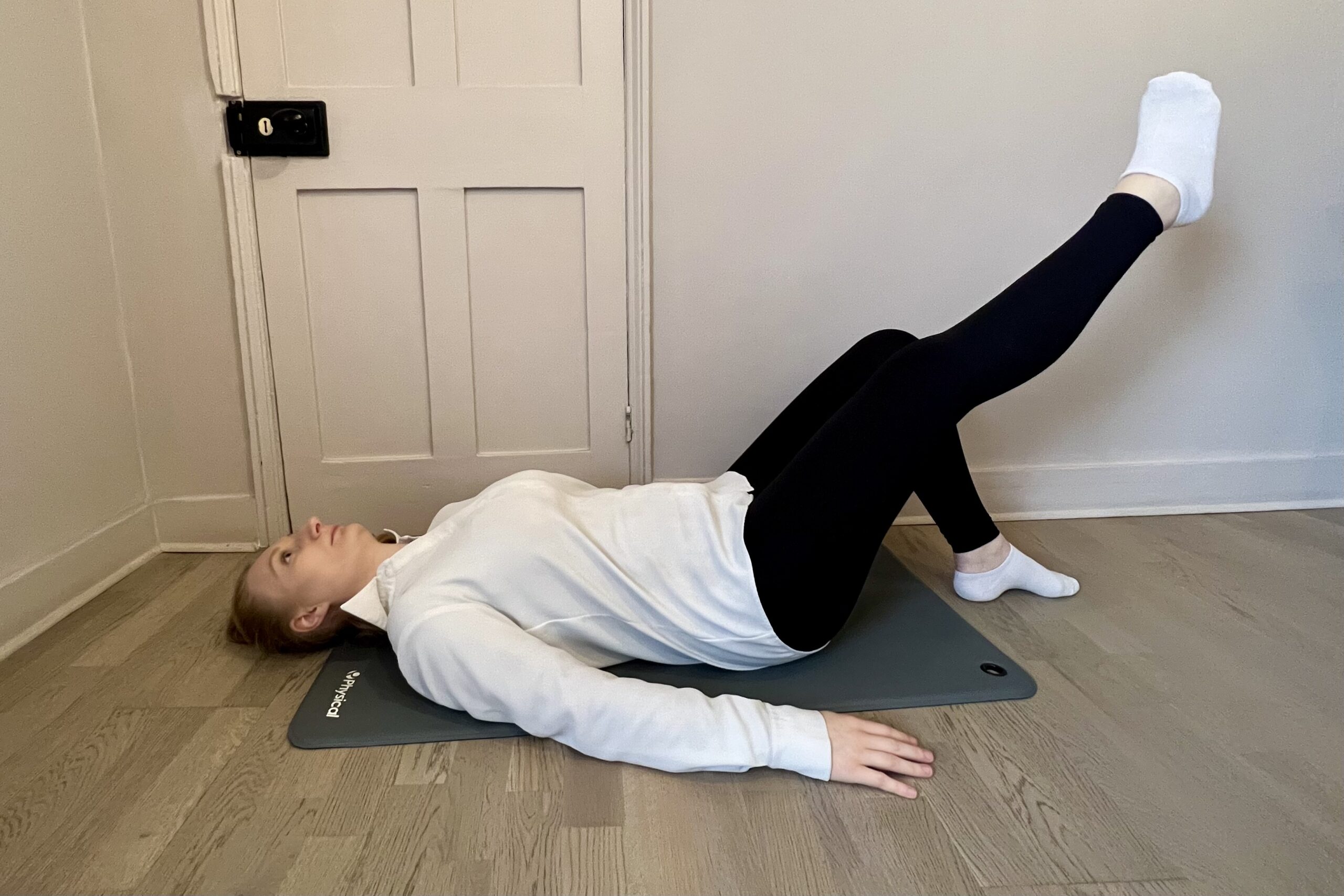 Lie flat on your back, with your knees bent, and hand under your lower back. Lift one leg straight in the air so your foot is pointing towards the ceiling. Contract your deep abdominal muscles by drawing your belly button towards the floor, and flattening your back against your hand. Lift one leg straight in the air so your foot is pointing towards the ceiling. Hold the pressure against your hand while you lower the leg to the floor, and back to the start position. Do not let the back arch. Try to breathe normally throughout the exercise. This is a lower abdominal and deep core strengthening exercise. Hold this position for 3 seconds, repeat on both sides 8 times.