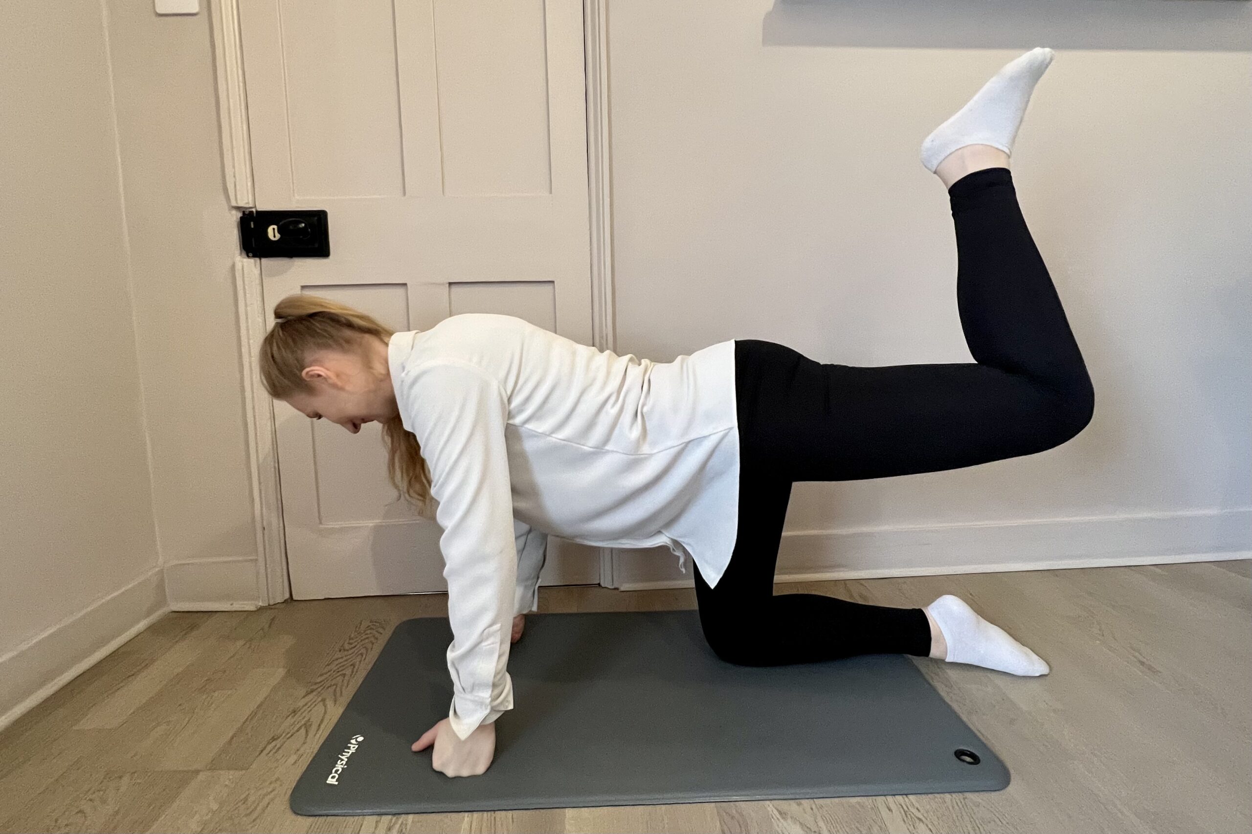 Position yourself on all fours, with your hands under your shoulders and knees under your hips. Keep your spine flat and chin tucked in. Draw your tummy button inwards towards your spine. With your leg bent at the knee joint, extend your leg behind you. Imagine you are pushing your foot towards the ceiling. Hold this position for 3 seconds then return to the start position. Repeat 8 times on either leg. This is a great core, hamstring and glute exercise.