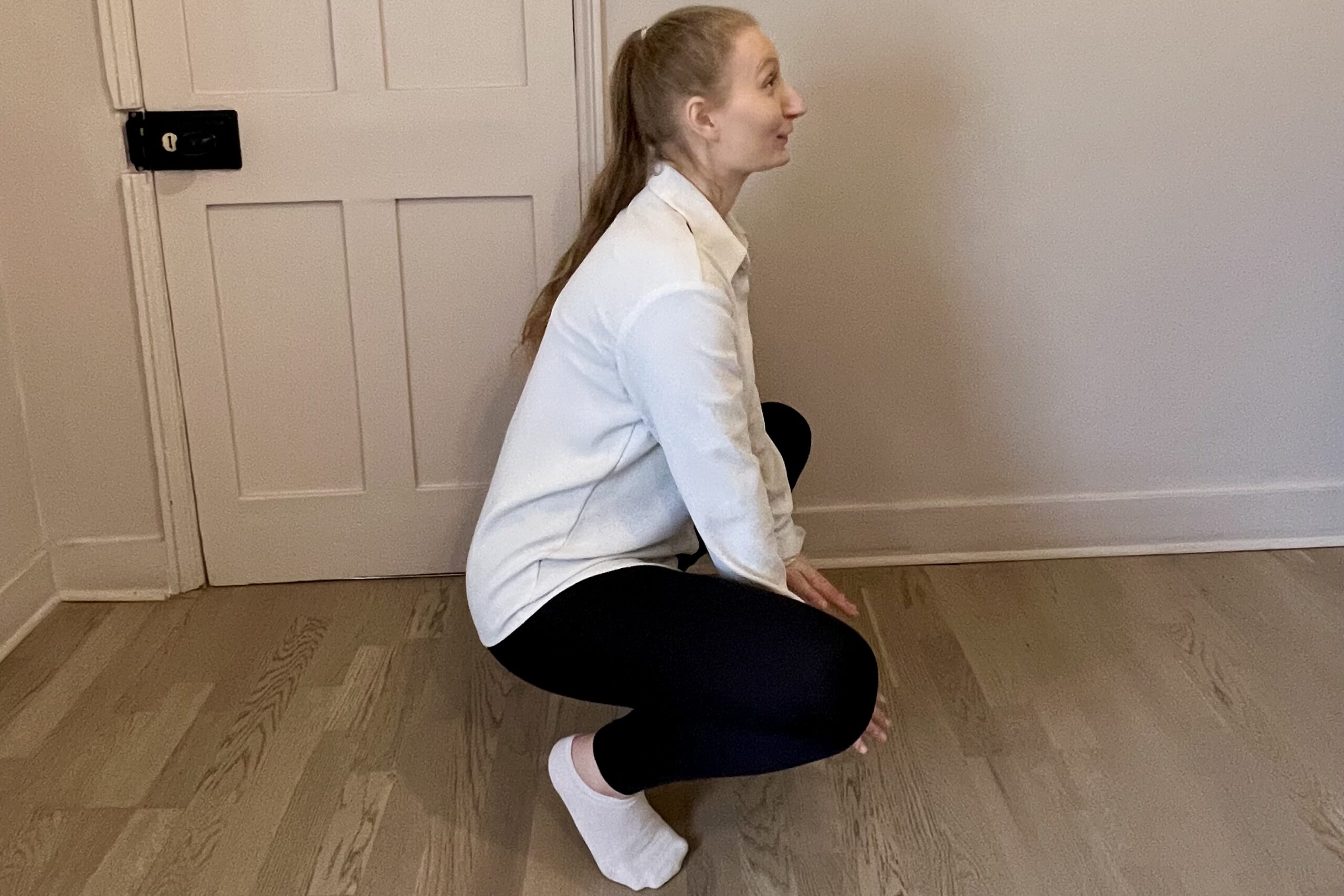 Stand with your feet wider than hip distance apart, turning them out slightly. Bend your knees as you lower your pelvis into a squat, keeping your heels on the floor if you can. Place your hands onto the floor. Use the wall to support your back if needed or squat onto a low stool. Once in this squatting position inhale and lift your pelvic floor muscles, drawing them up towards your naval. Hold them tight while exhaling and inhaling once. Then release them gradually with your next exhalation. Repeat this 10 times. This is not suitable if you have had a cervical stitch, varicosities or your baby is breech after 34 weeks. This exercise can help relax and strengthen your pelvic floor muscles helping to prevent prolapse.