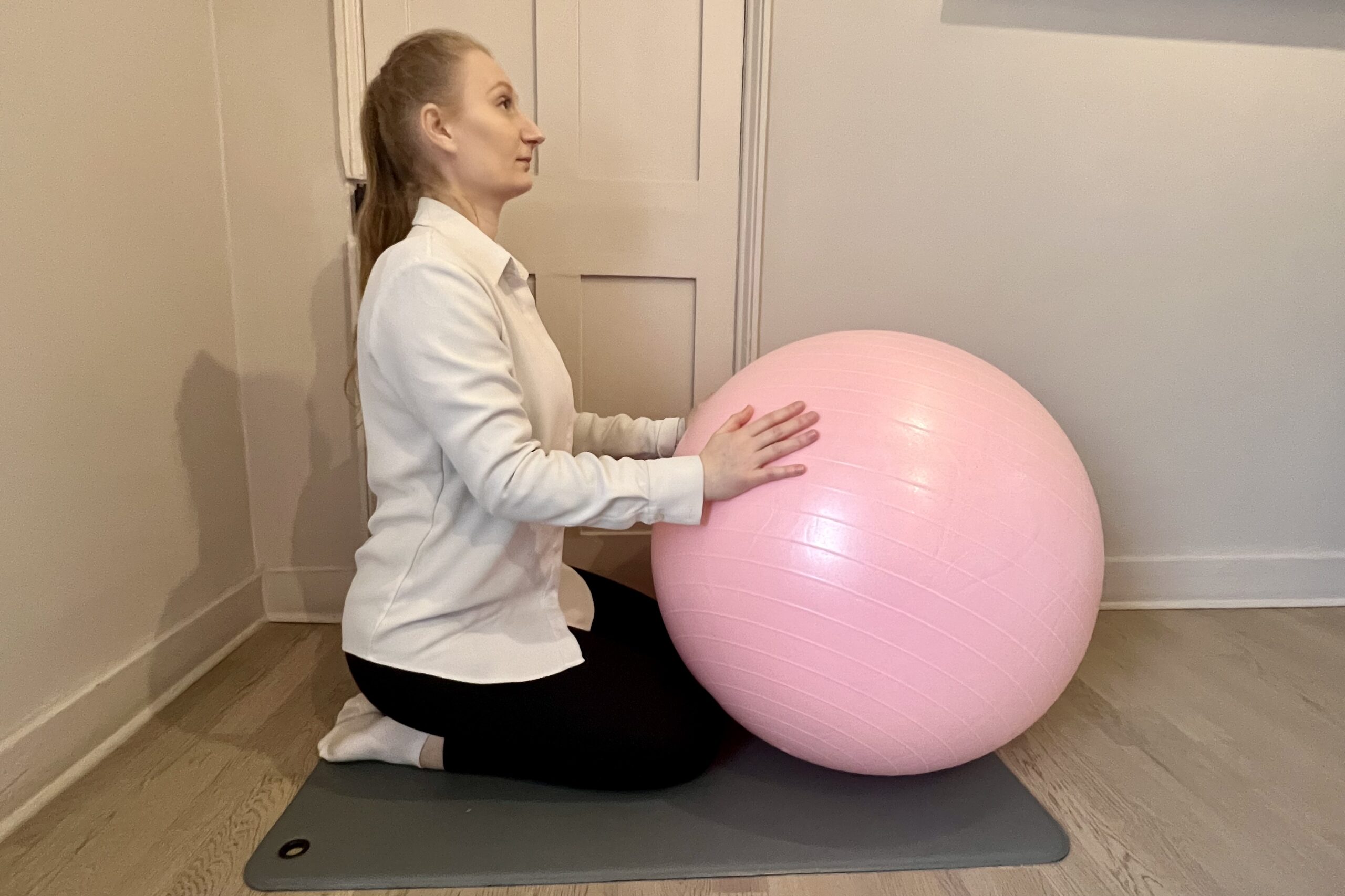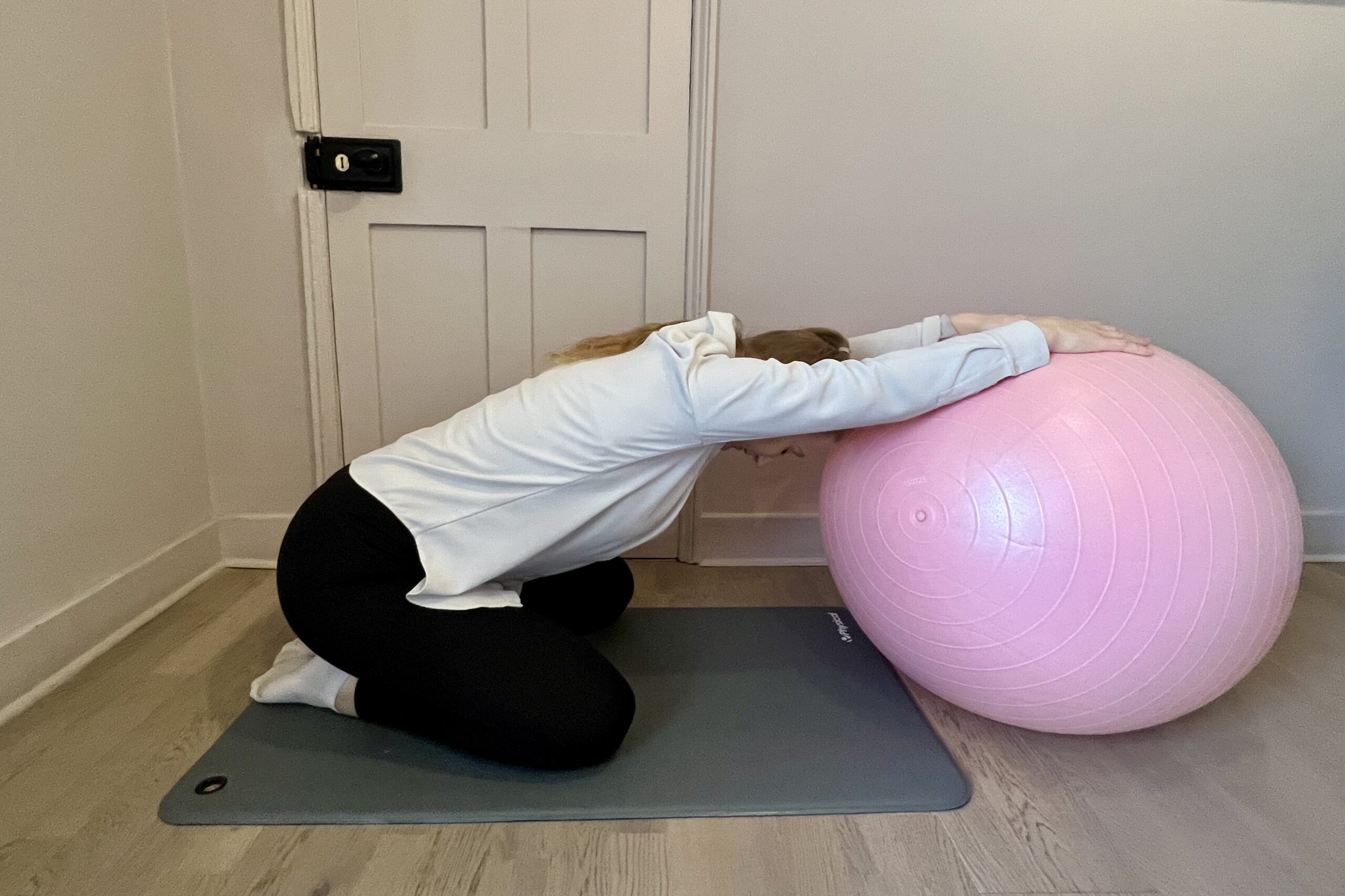 Sit on your heels with your arms on a Swiss ball. Gently stretch your arms out by rolling the ball forwards. Breathe deeply. Drop your shoulders down your back while keeping your elbows straight and your hands light. Release your lower back by lengthening it towards your heels. This exercise stretches and releases your chest muscles and shoulders and helps with breathing. This exercise may also help relieve symptoms of heartburn and back pain.