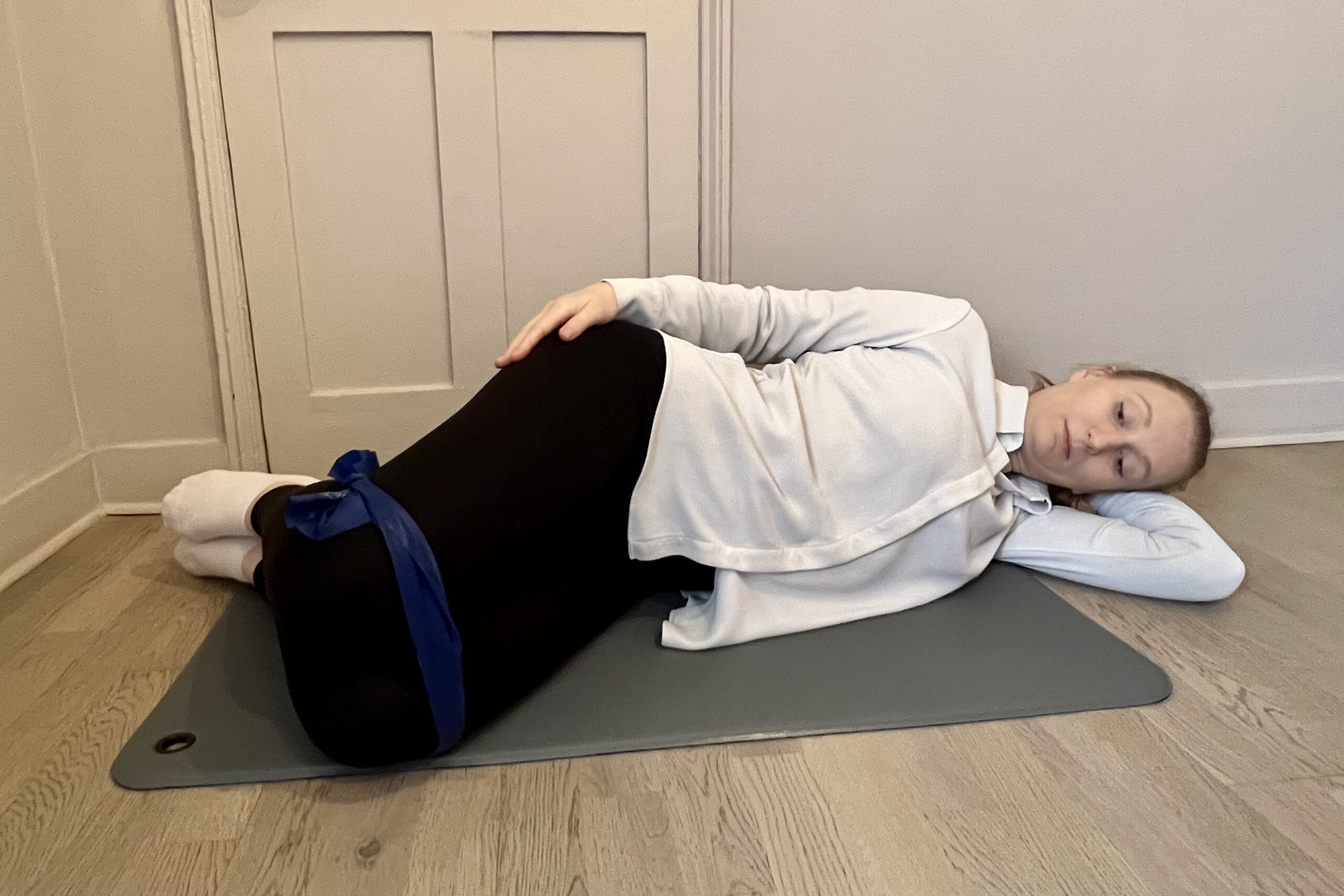 Lie on your side, with both knees bent, and place an exercise band around your thighs just above your knees. Keeping your feet together, open your knees, like a clam, hold, and return to the start position. If you find the exercise too tough, go back to the clam without resistance, or lengthen the exercise band. This is a good strengthening exercise for your gluteal (buttock) and outer thigh and hip muscles and can help with pelvic girdle pain. Hold each rep for 3 seconds, and repeat 8 times on both sides.