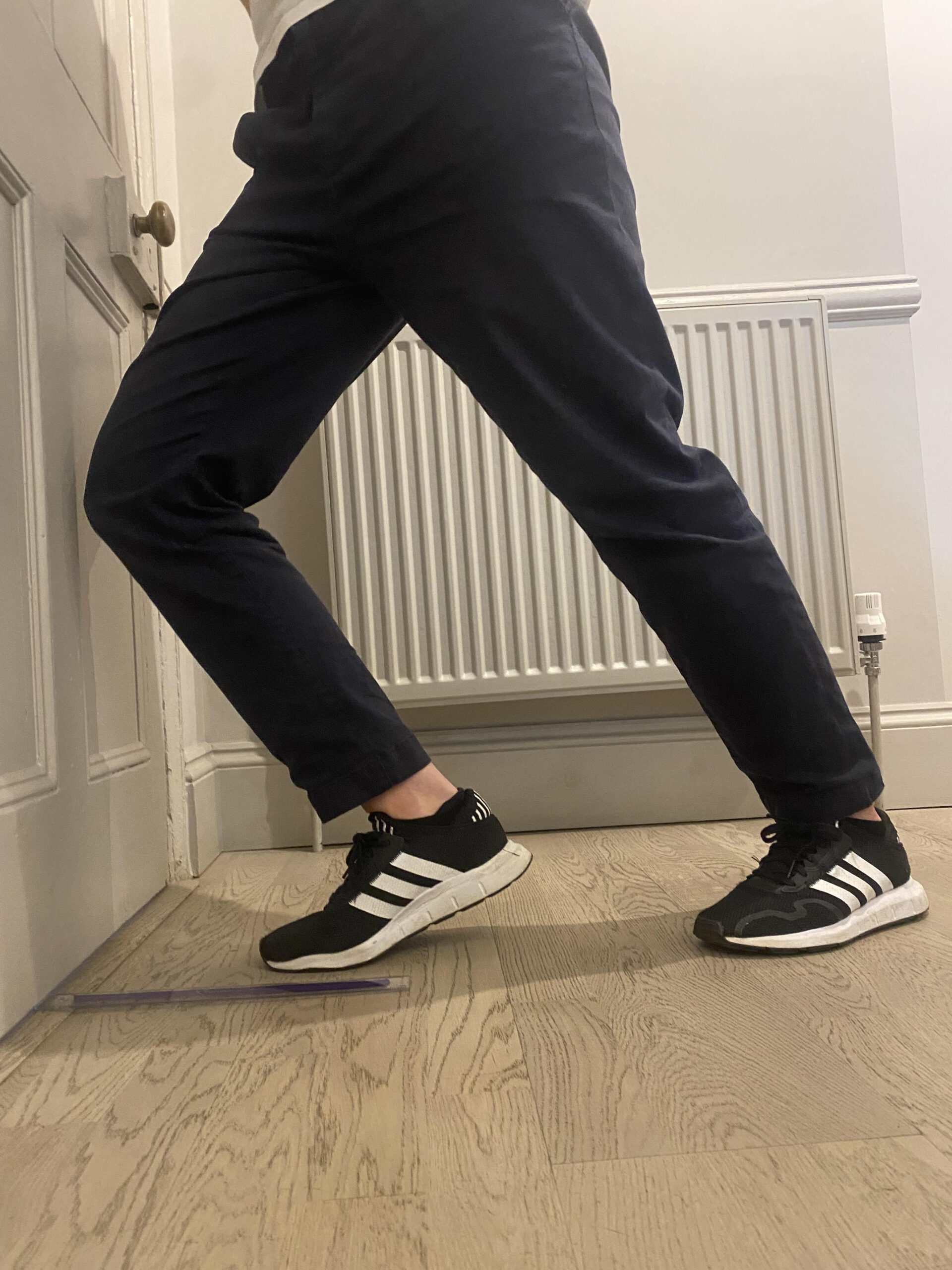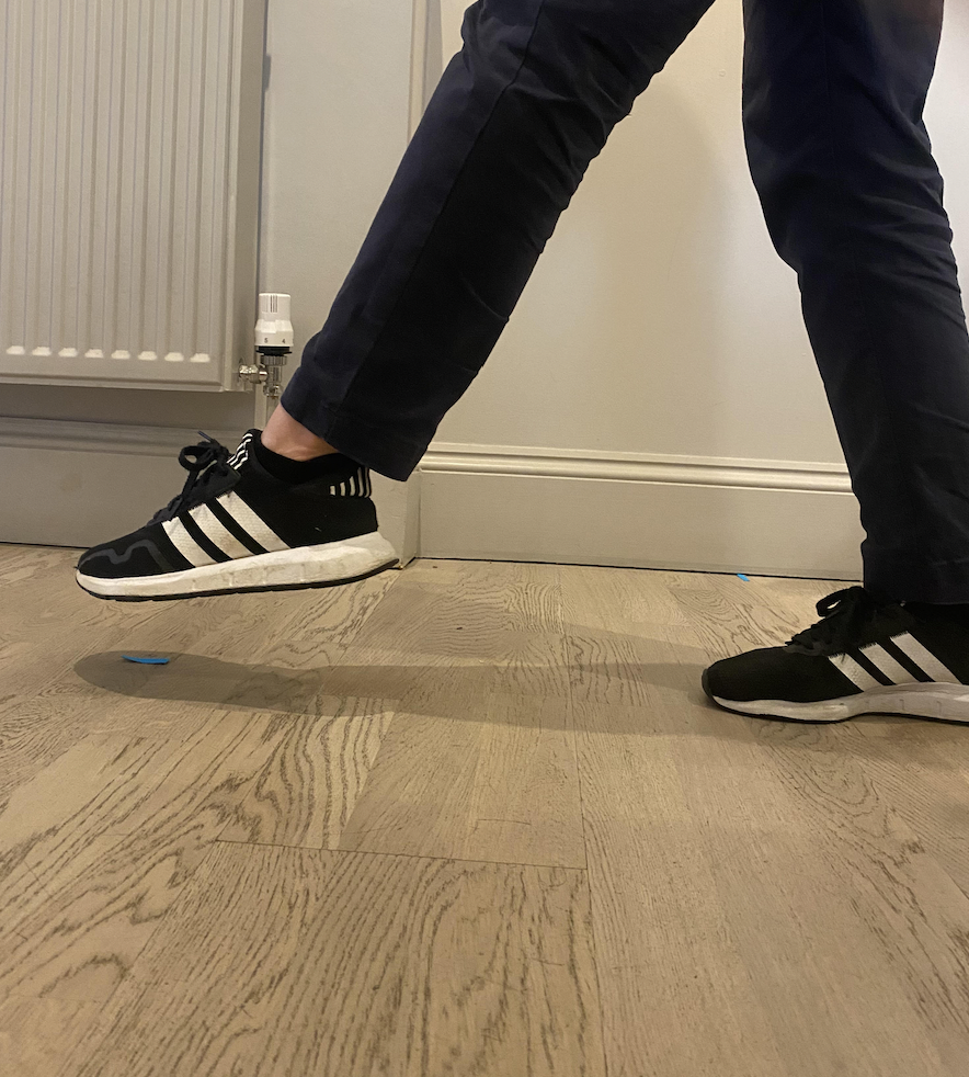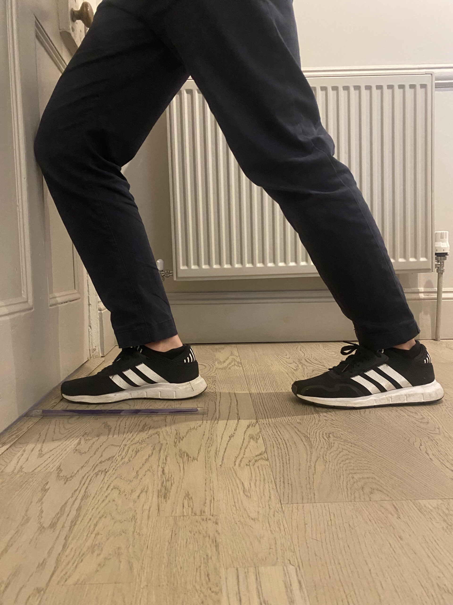 Place the measuring tape flat on the floor staring at the wall, then align your big toe and heel along-side the tape measure. You other leg should be place slightly behind the front foot ensuring your foot is facing forwards.