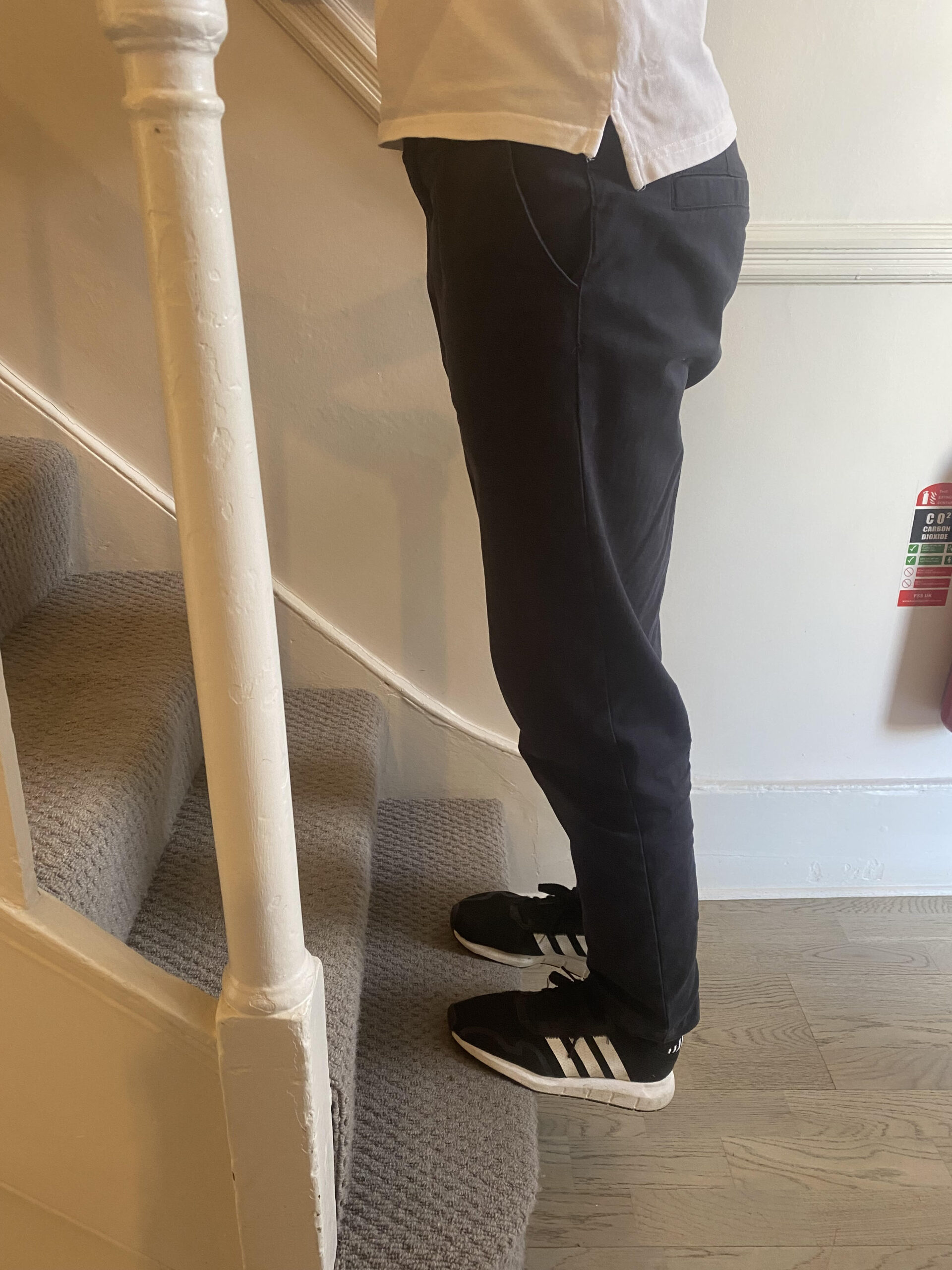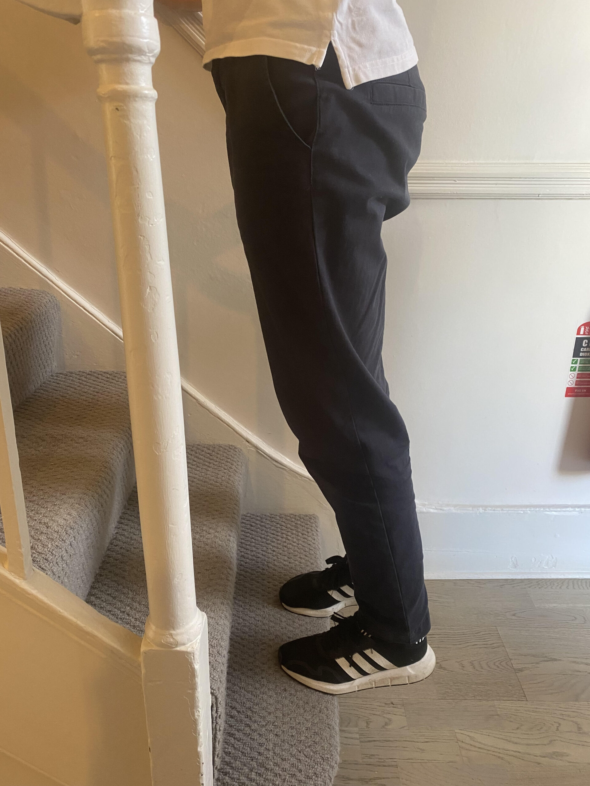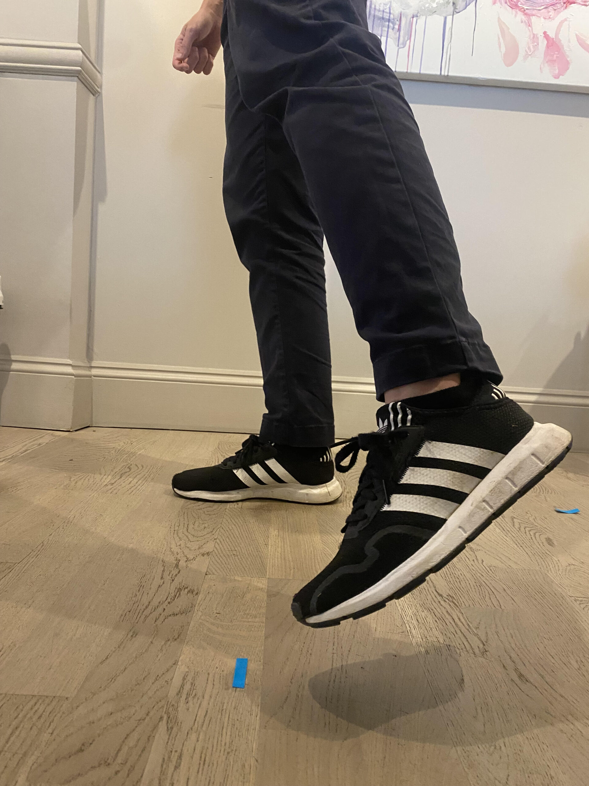 Place the measuring tape flat on the floor staring at the wall, then align your big toe and heel along-side the tape measure. You other leg should be place slightly behind the front foot ensuring your foot is facing forwards.