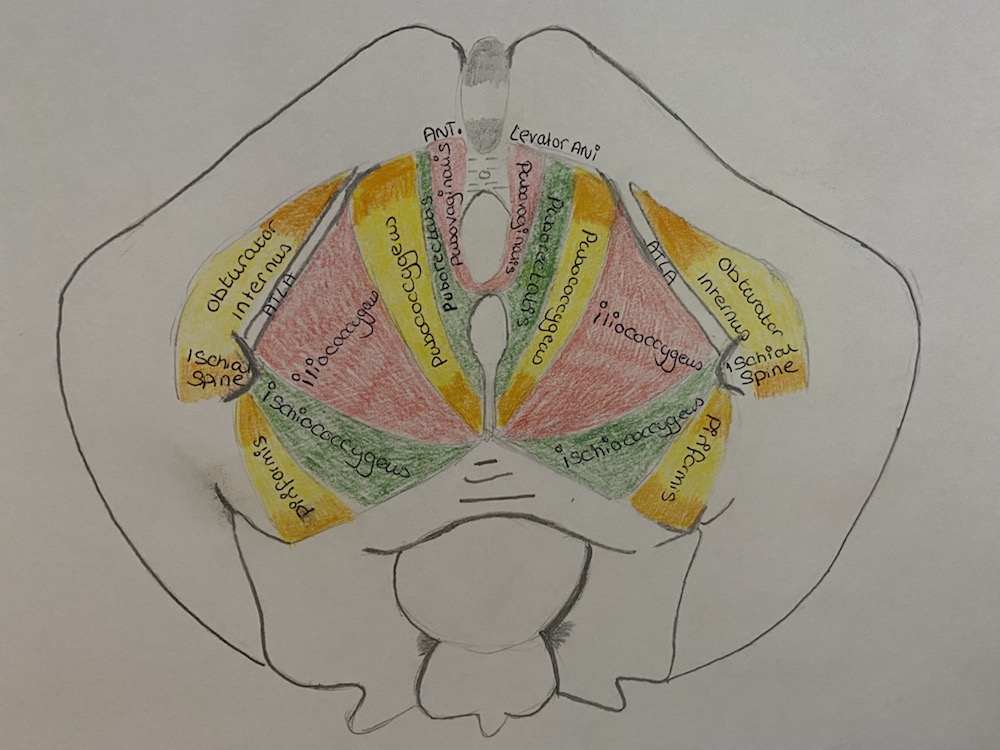 It is a group of muscles going from the coccyx at the base of your spine to the symphesis pubis, (pubic bone) at the front of your pelvis. Forming a sling or hammock of muscle which effectively creates the ‘floor’ of your pelvis. It has 3 holes in it. The urethra at the front, the vagina in the middle and the anus at the back and the muscle wraps around each of these openings.