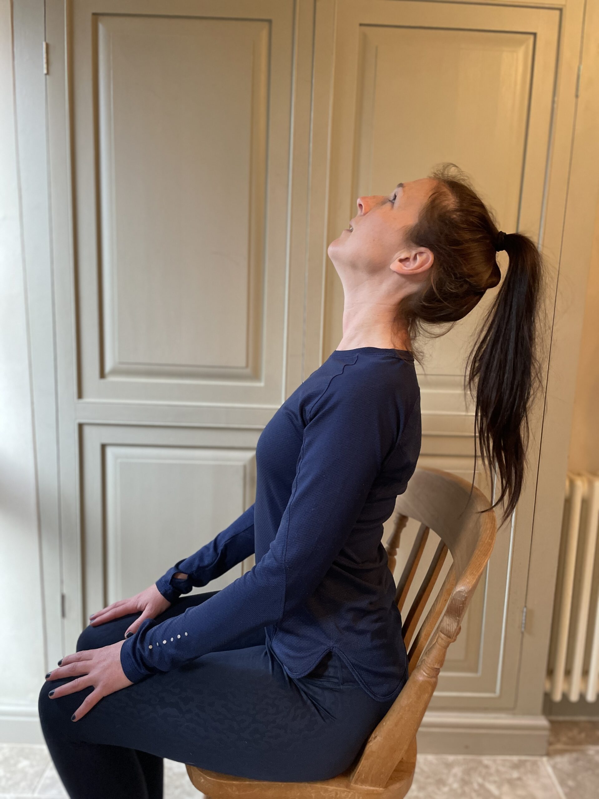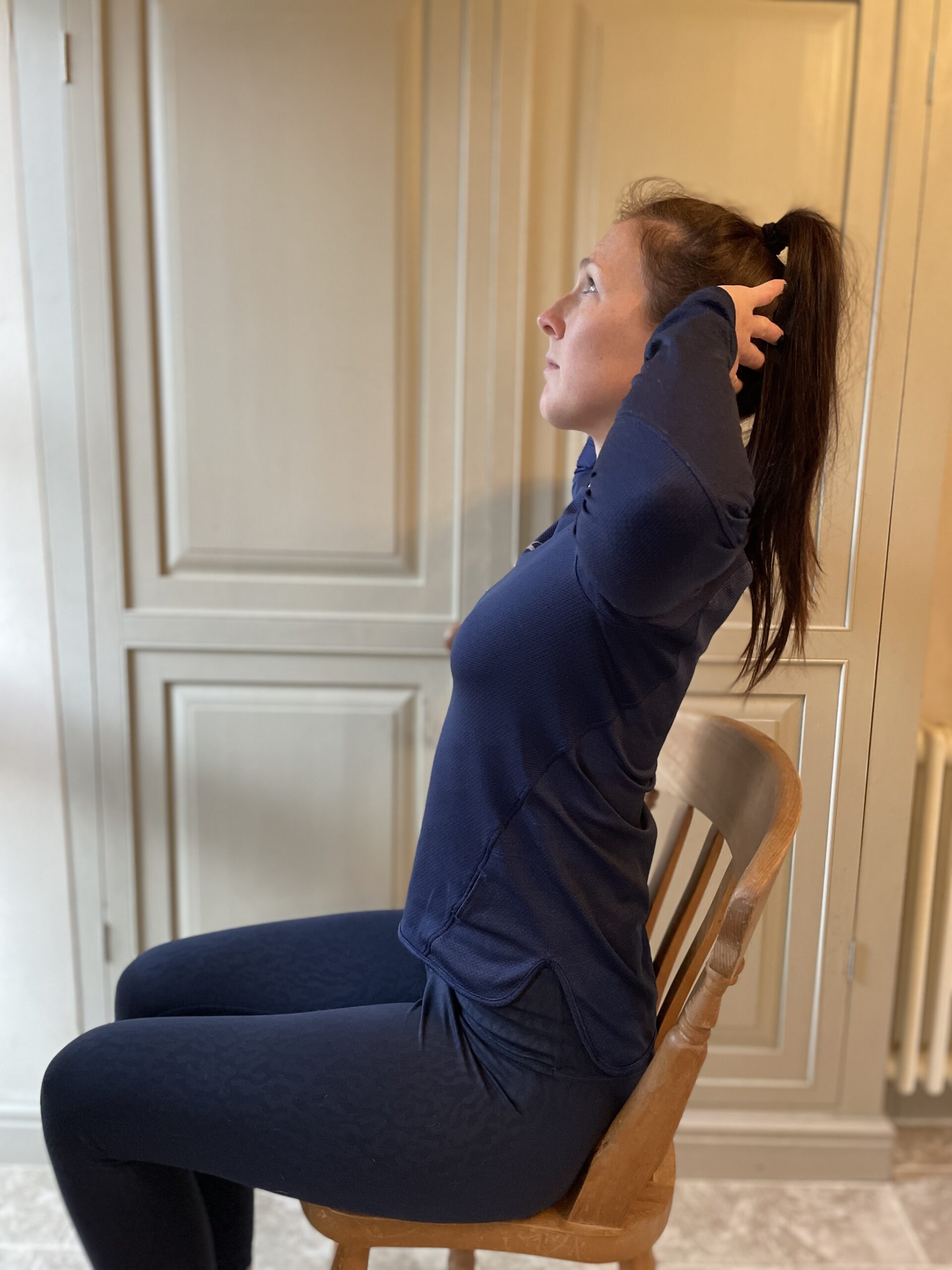 Place your hands behind your neck to support the neck, focus your movement on the upper back and gently lean backwards, lifting the chest up. Try and keep the lower back still. Repeat 5-10 times.