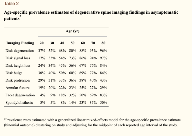 A huge study was done on numerous people that did NOT have pain. They were given an MRI on their spine to see the features that were present. The results are amazing and very reassuring that you should be able to return to a pain free life, even if you have a symptomatic version of these findings!